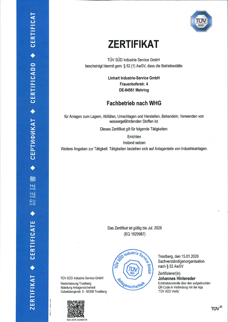 Zertifikat SCC**:2021 – Geltungsbereich: Maschinenverlagerung, Betriebsumzüge, Transporte, De- und Remontagen, Montagen, Wartung und Instandsetzung, Betriebsmittelfertigung.
